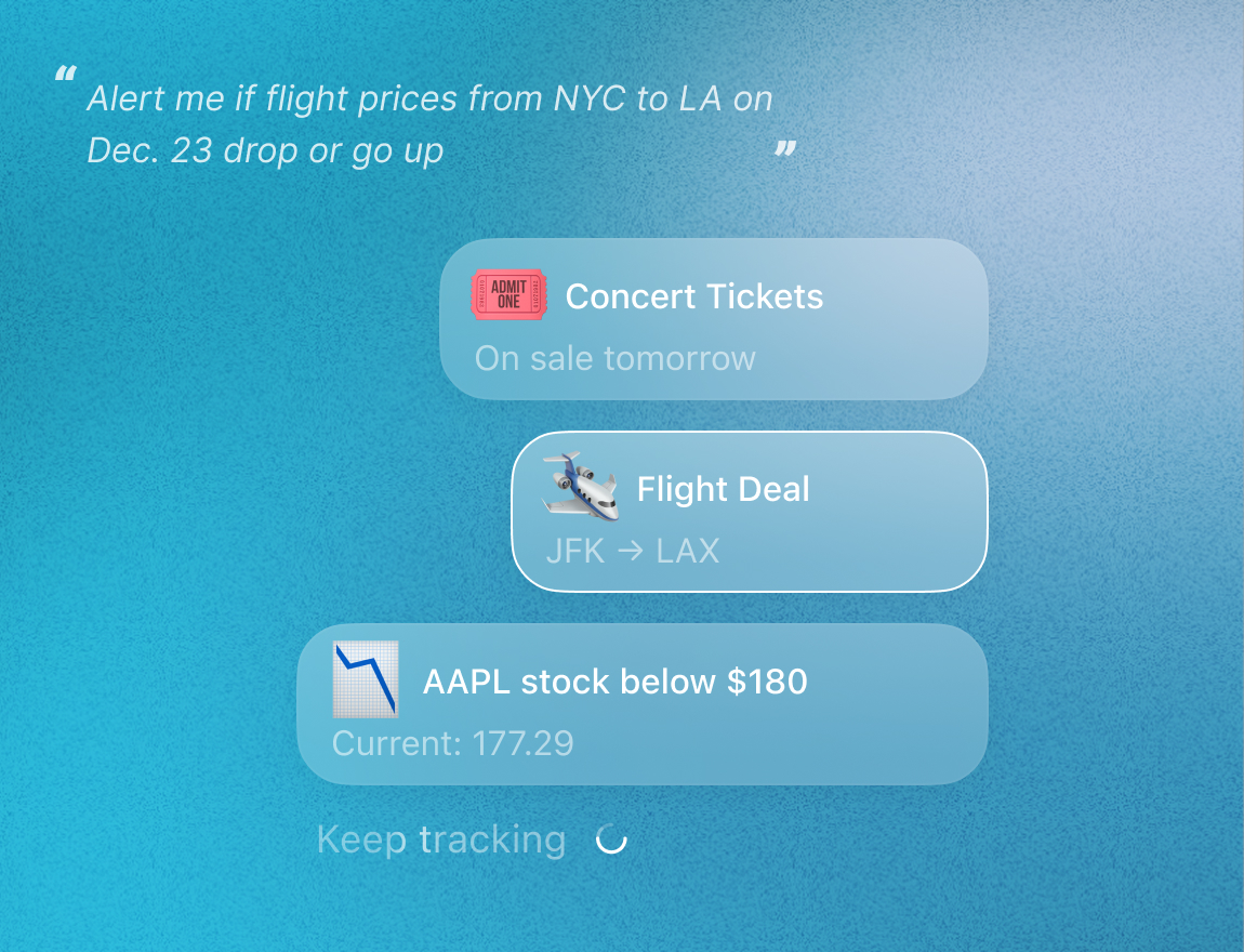 Dites à Toki quoi surveiller — baisse d'actions, chute de prix de billets d'avion, mise en vente de billets, n'importe quoi. Toki le surveille pour vous, vous tient informé en temps réel et peut définir des rappels et des tâches pour que vous ne manquiez jamais le bon moment pour agir.