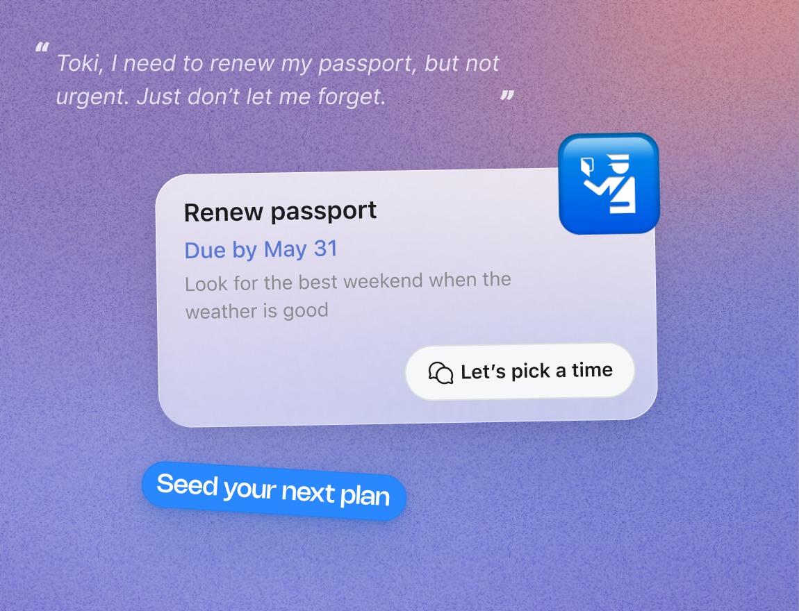 Avec Toki, votre agent IA ne vous aide pas seulement à vous souvenir.